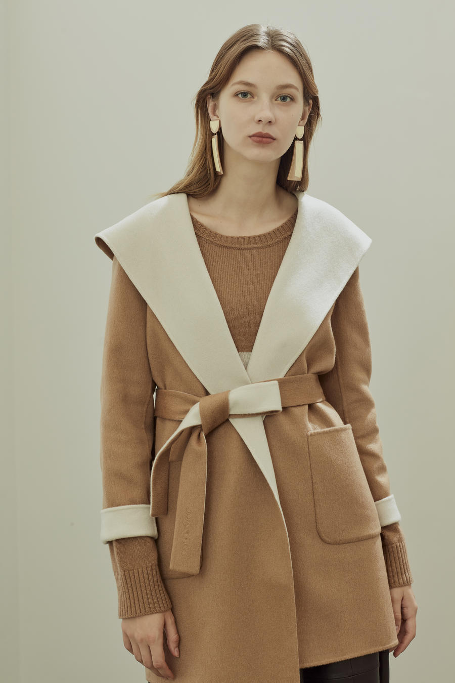 Pure cashmere reversible coat featuring a straight fit shape. Shawl collar with a hood and patch pockets on the front. Wraparound closure with belt. The resulting coat is unlined, impeccably finished inside and out.