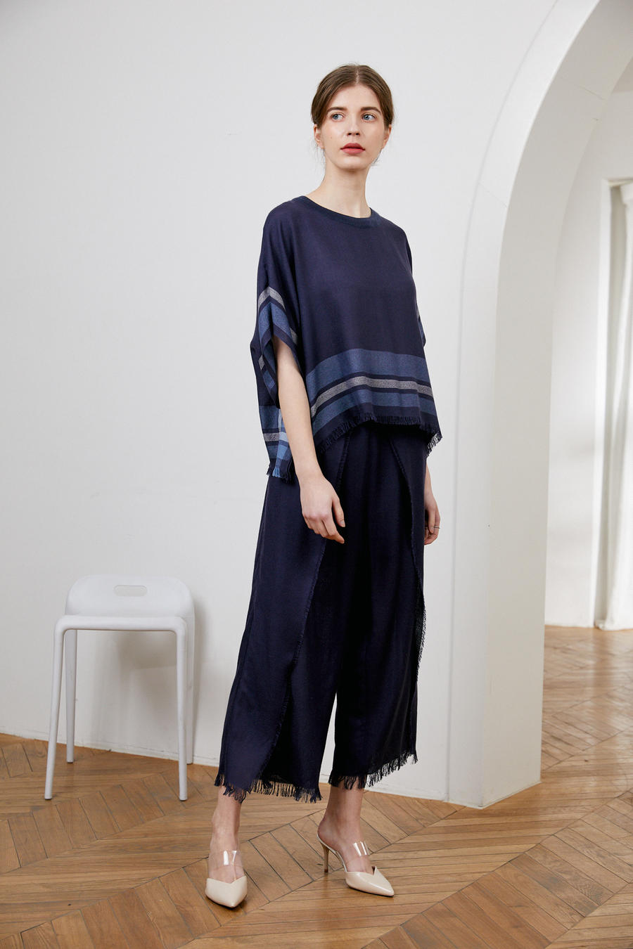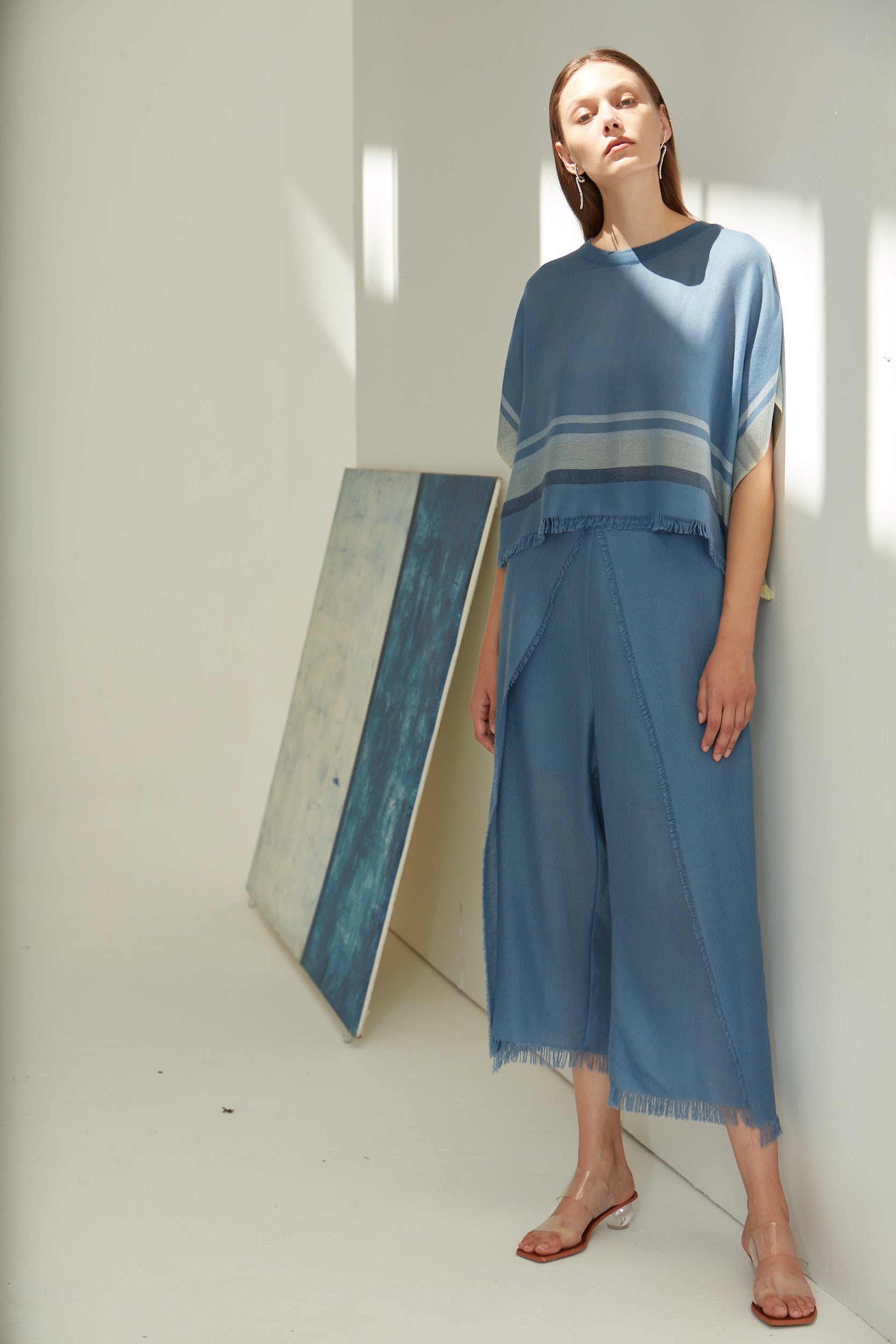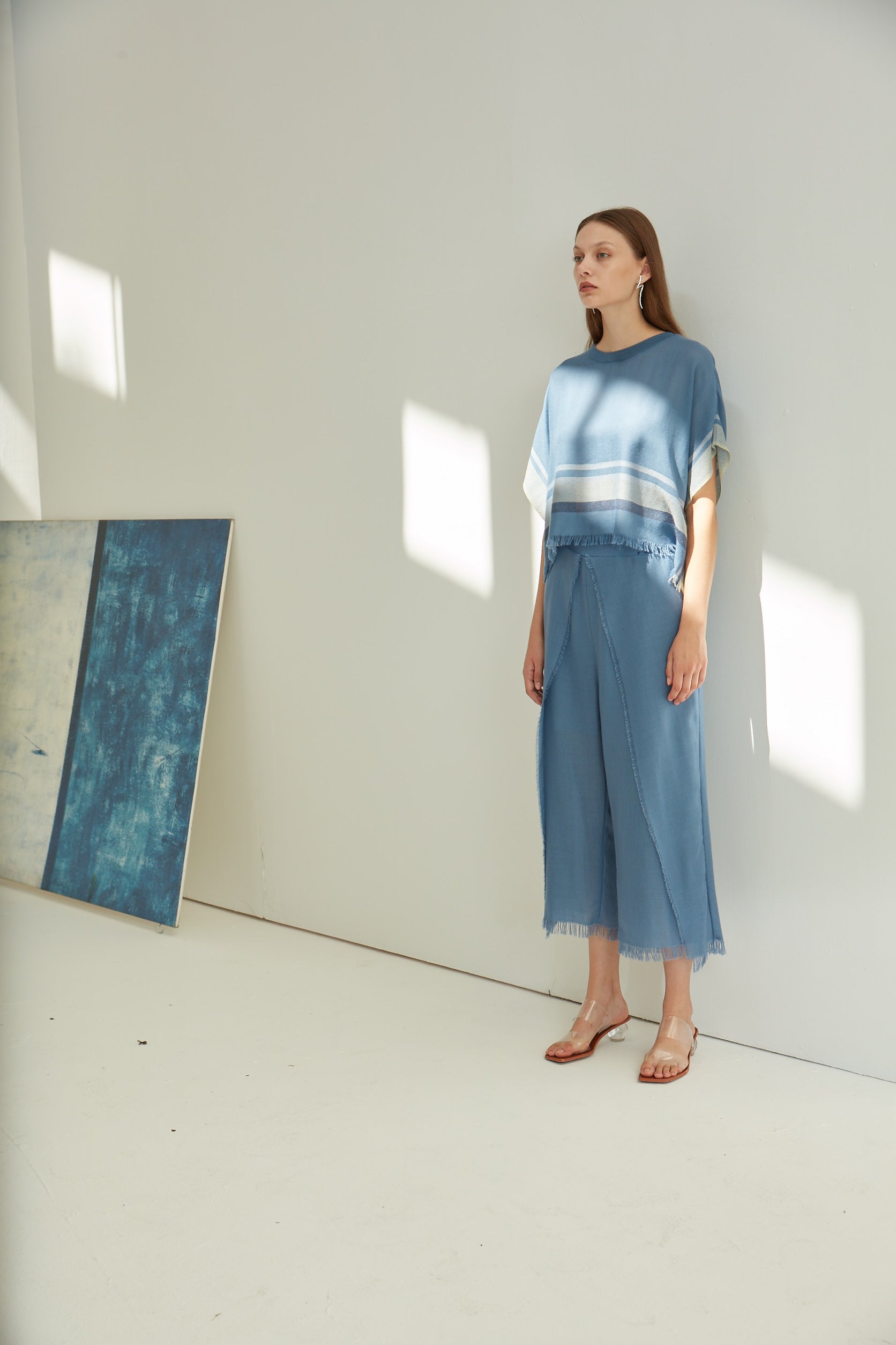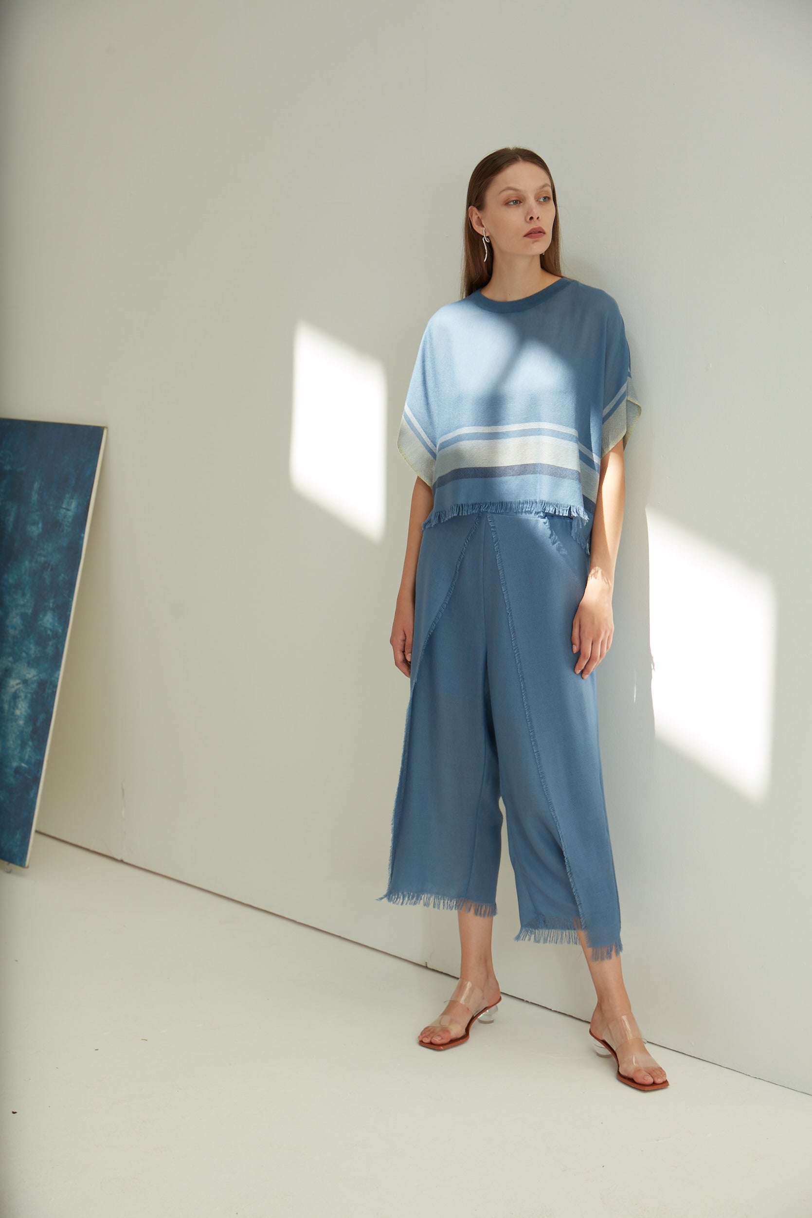 Ultra-thin boxy fit cashmere top with crew neck and short low set-in sleeves. The cashmere material is from Sandriver's own Inner Mongolian pasture. The tassels are all hand-sewn and very comfortable to wear. The unique craftsmanship of worsted cashmere is comfortable and refreshing even in summer.