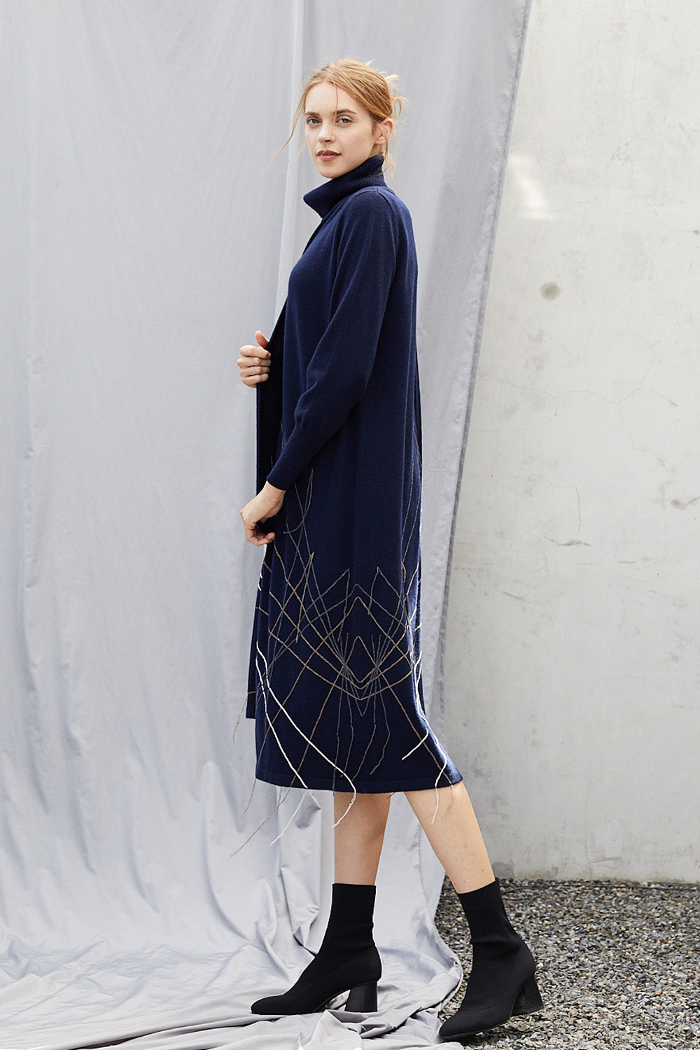 Asymmetric long cardigan/dress with turtle neck and hand sewen stripe lines.