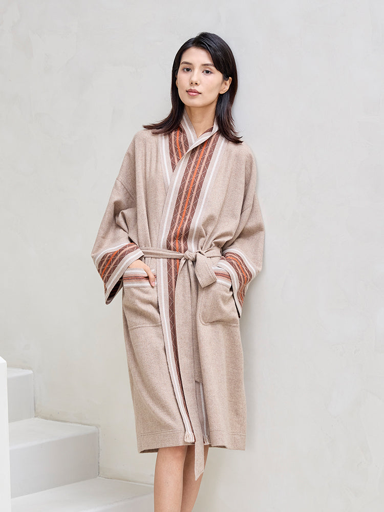 Presenting traditional hand-twisted cashmere yarn through brocade techniques, the fabric combines a three-dimensional handmade feel...