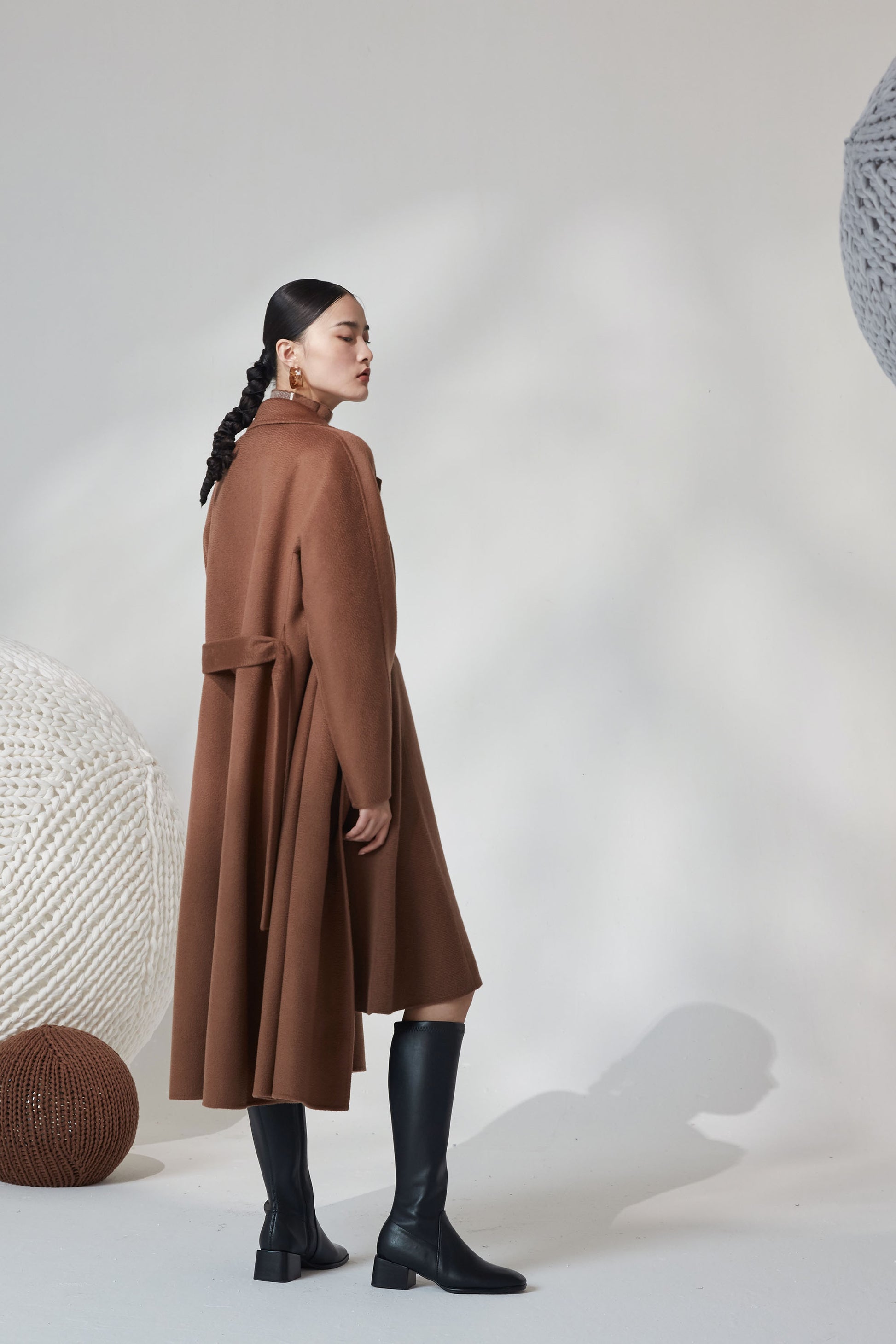 Below knee length reversible double-breasted coat with lapel collar, crafted from 100% cashmere, featuring a belt and hand-sewn hem. The resulting coat is unlined, enveloping and very light, impeccably finished inside and out.