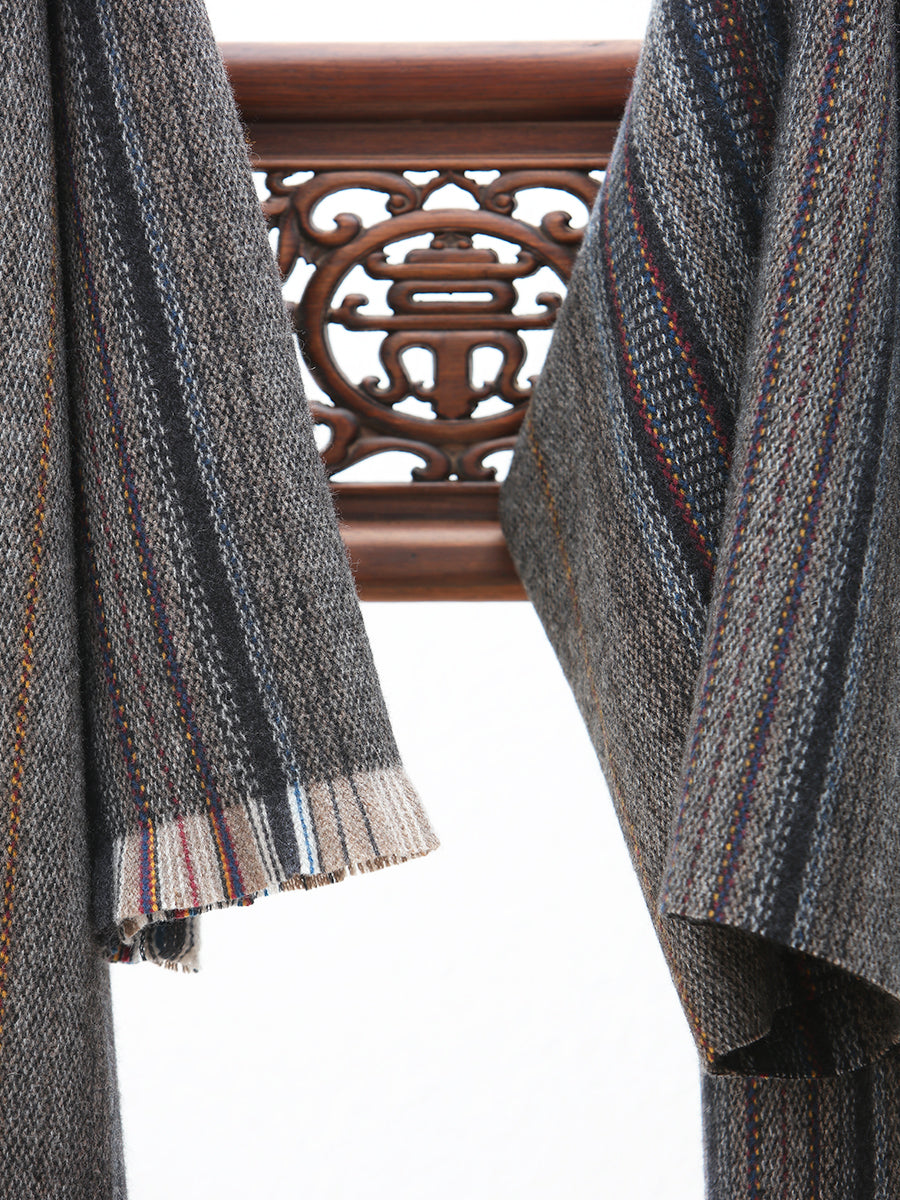 Indulge in ultimate comfort with our exquisite cashmere and yak wool blend robe, adorned with a classic mandarin collar and stylish fringe accents.