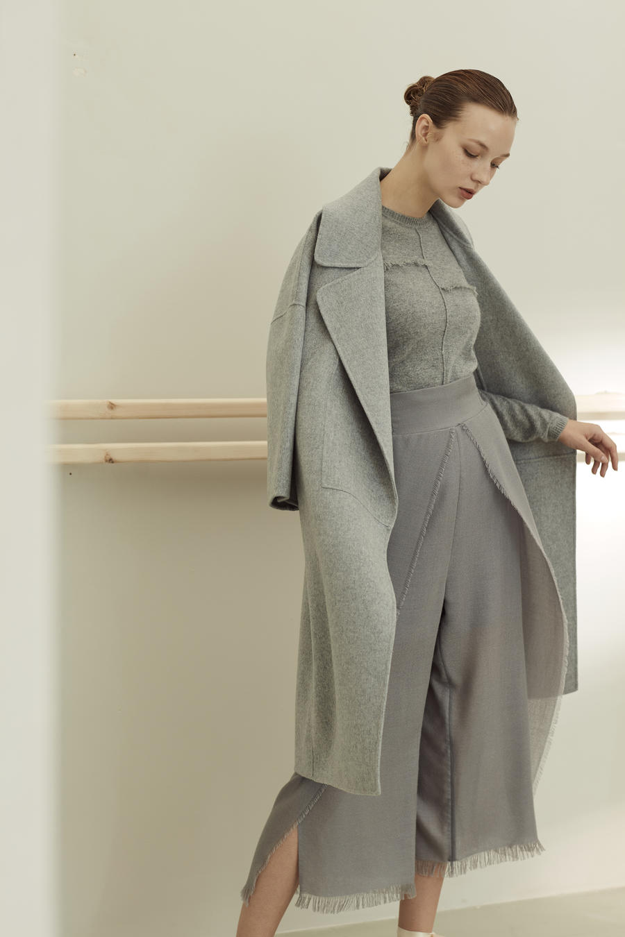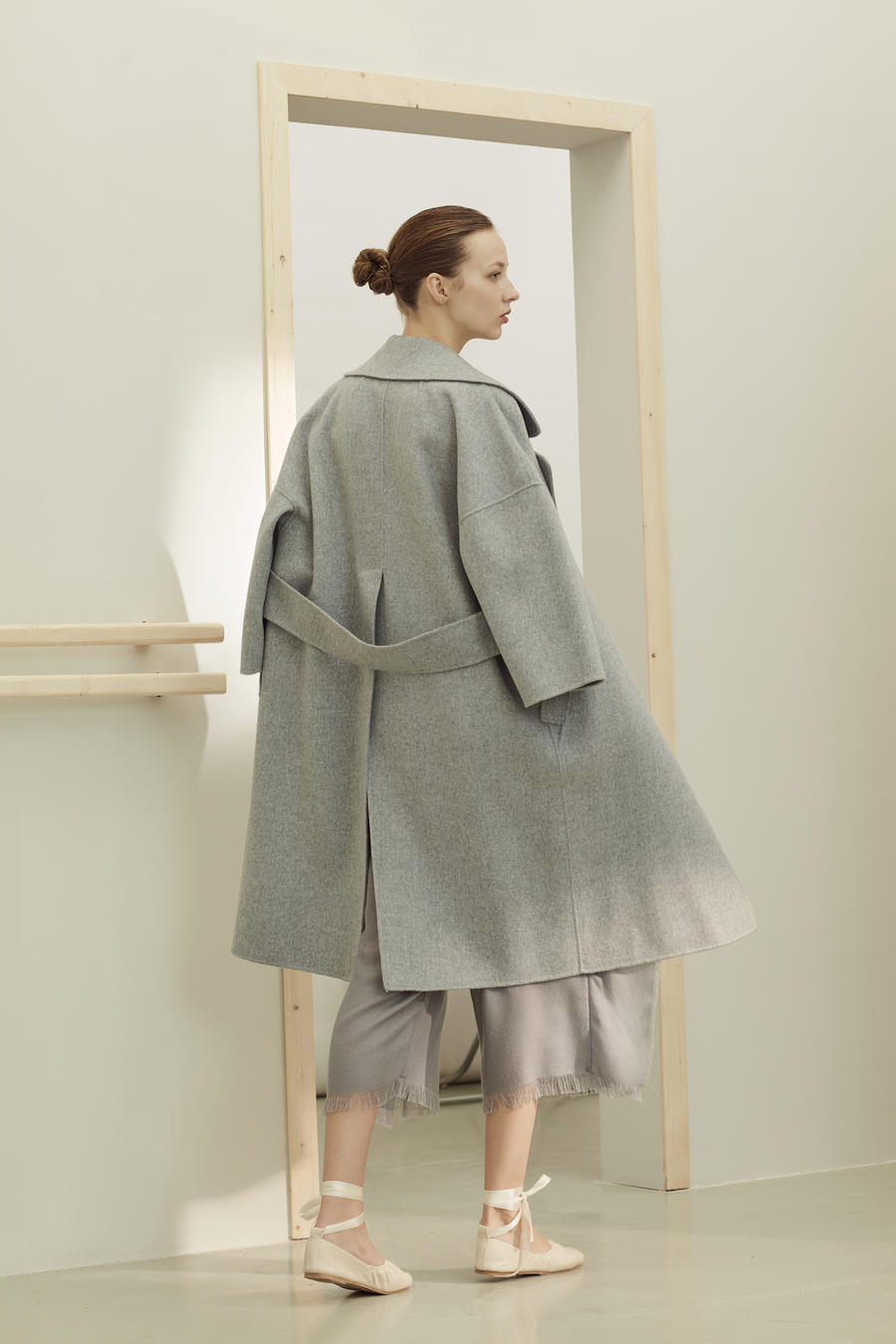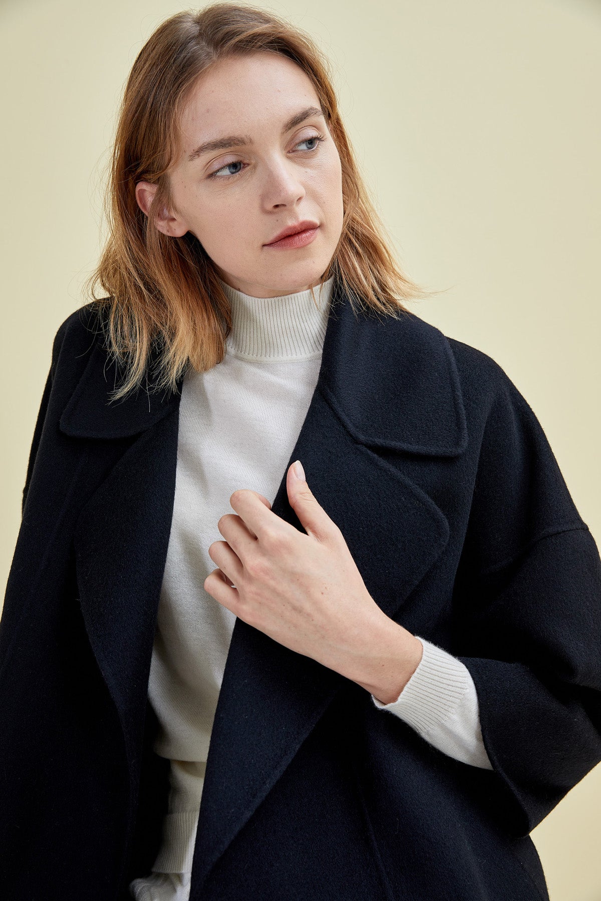 Long wraparound coat in hand-sewn, double pure cashmere fabric with lapels and patch pockets. This item is slightly flared, with kimono-style sleeves at the front and raglan at the back. Unlined. Fastens with matching belt.