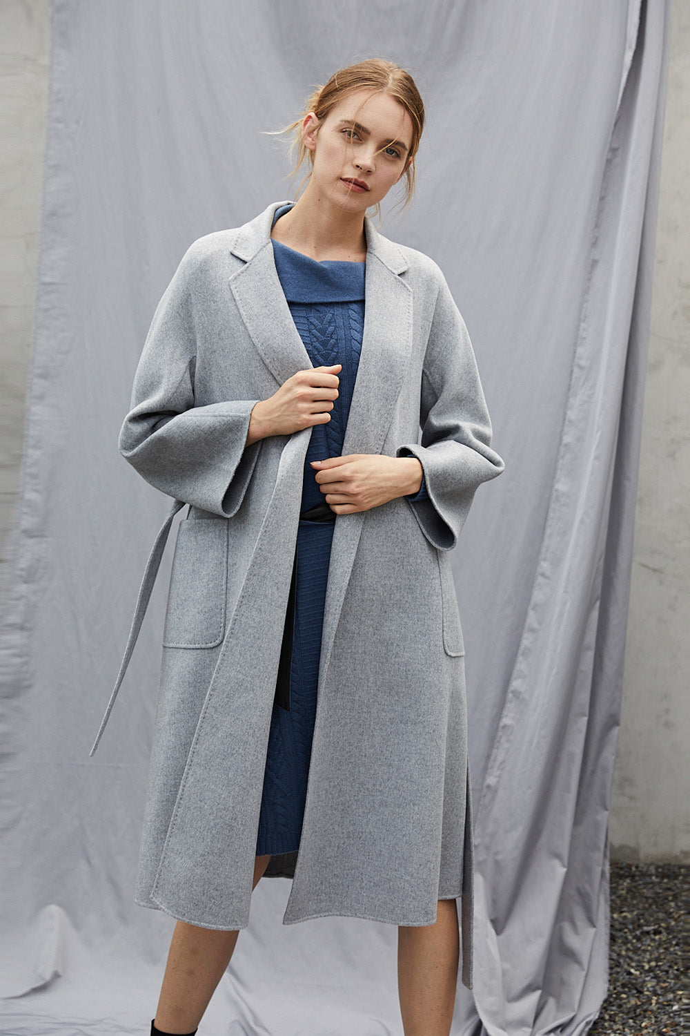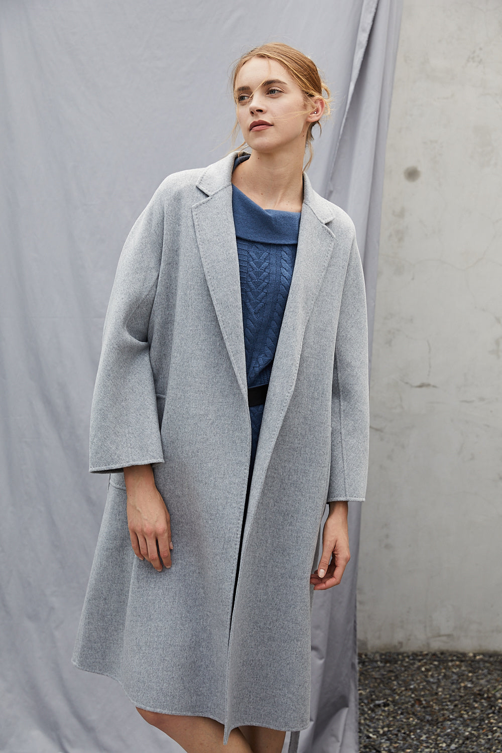 Wraparound coat in hand-sewn, double pure cashmere fabric with lapels and patch pockets. This item is slightly flared, with kimono-style sleeves at the front and raglan at the back. Unlined. Fastens with matching belt.