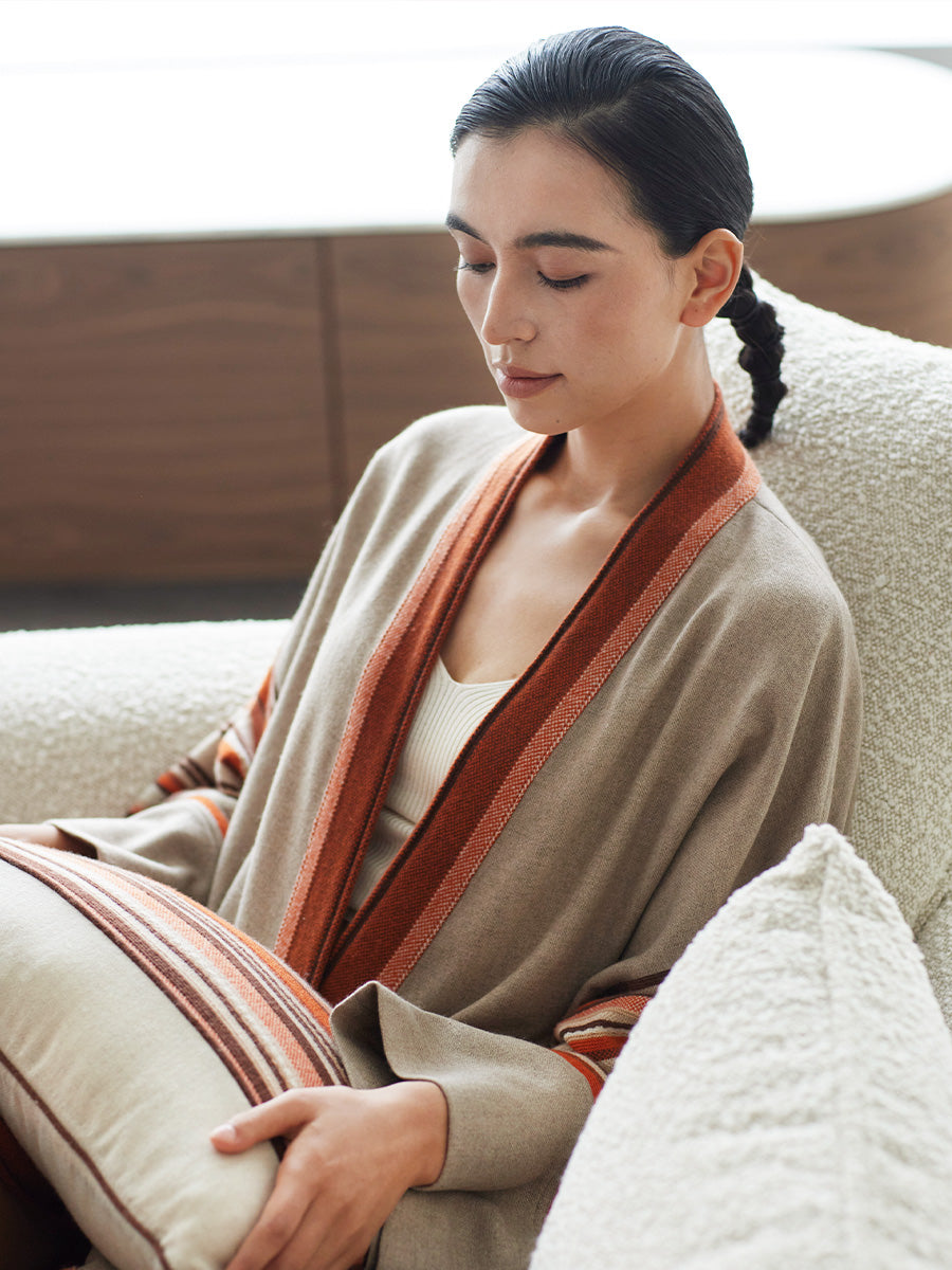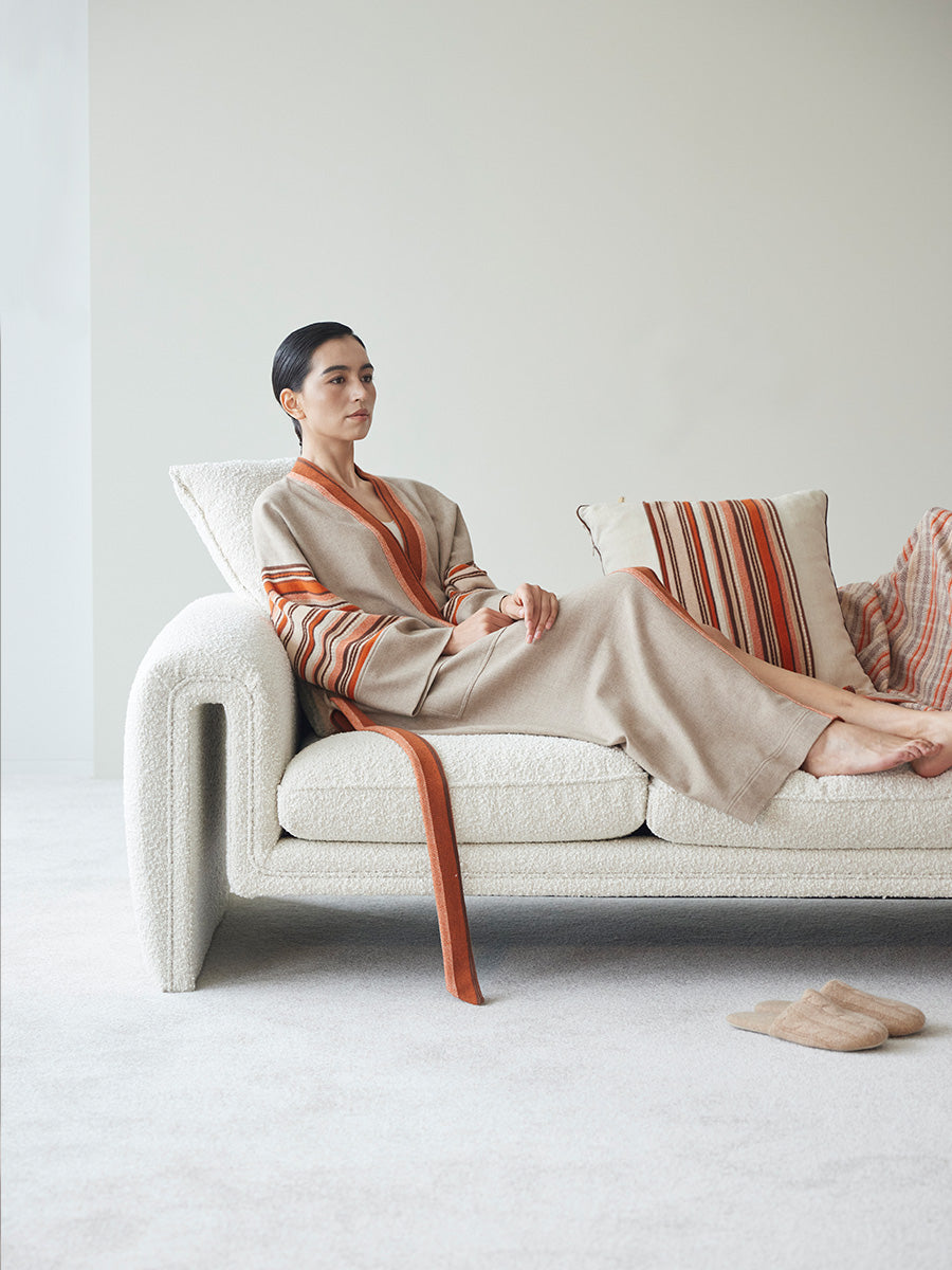 Wrap yourself in comfort with this cozy cashmere robe, adorned with a soft hand-sewn trim in a cheerful orange color.