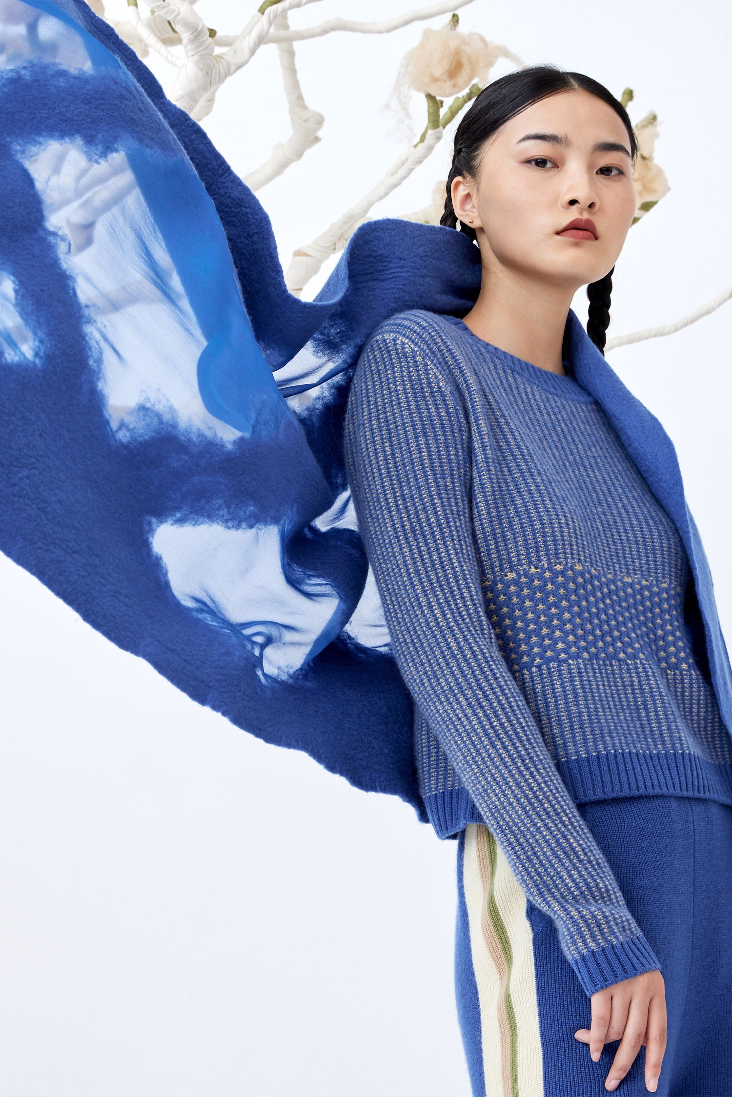 Unique traditional Mongolian handcrafted felting shawl joint with 100% cashmere and pure silk, checkered pattern.