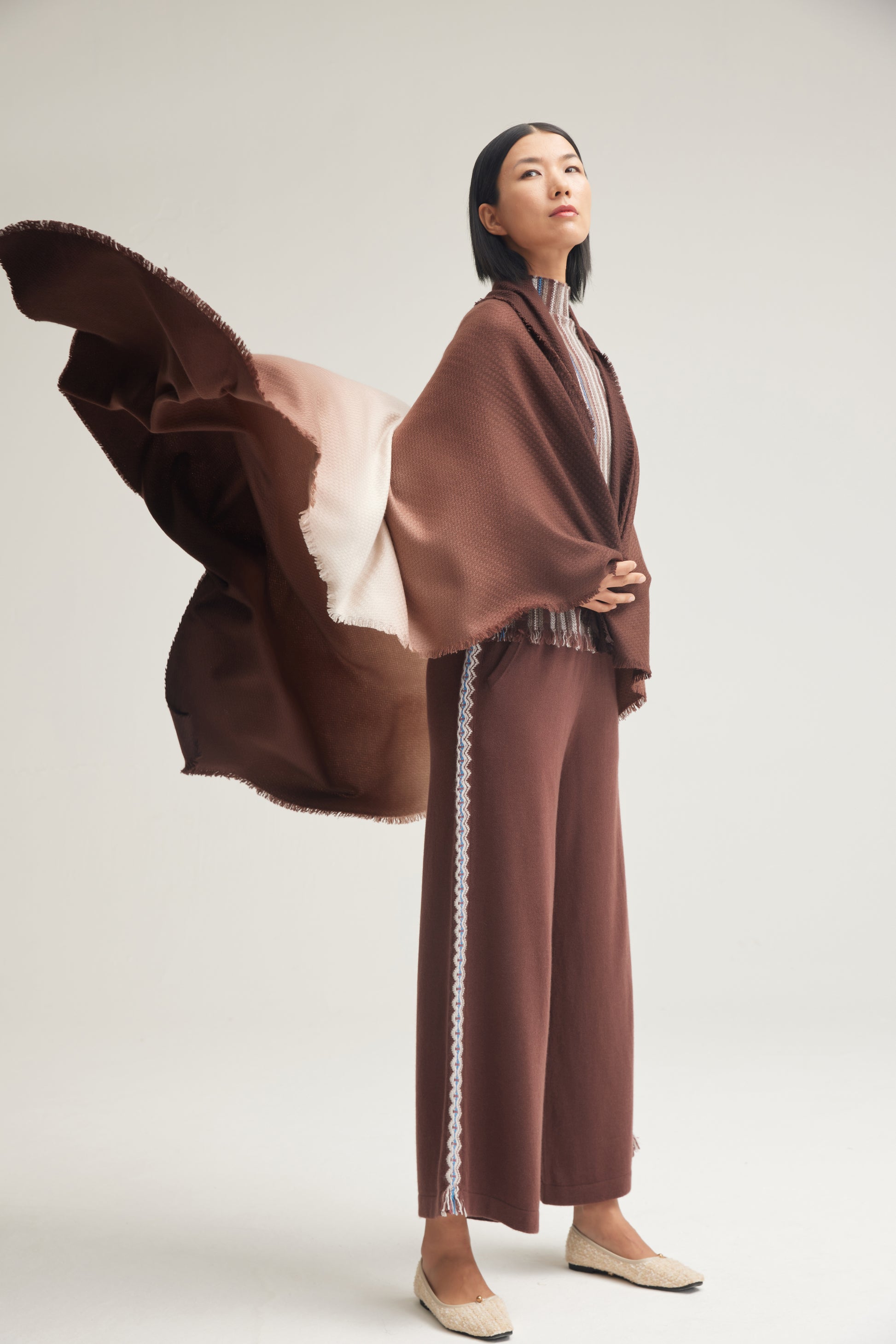 The hand-woven blanket, originating from an ancient tibet handcraft technique, 100% cashmere, two-tone dip dye design.