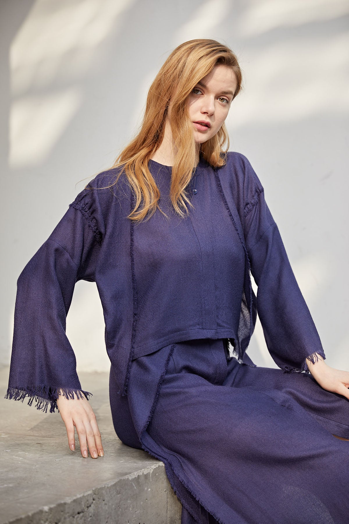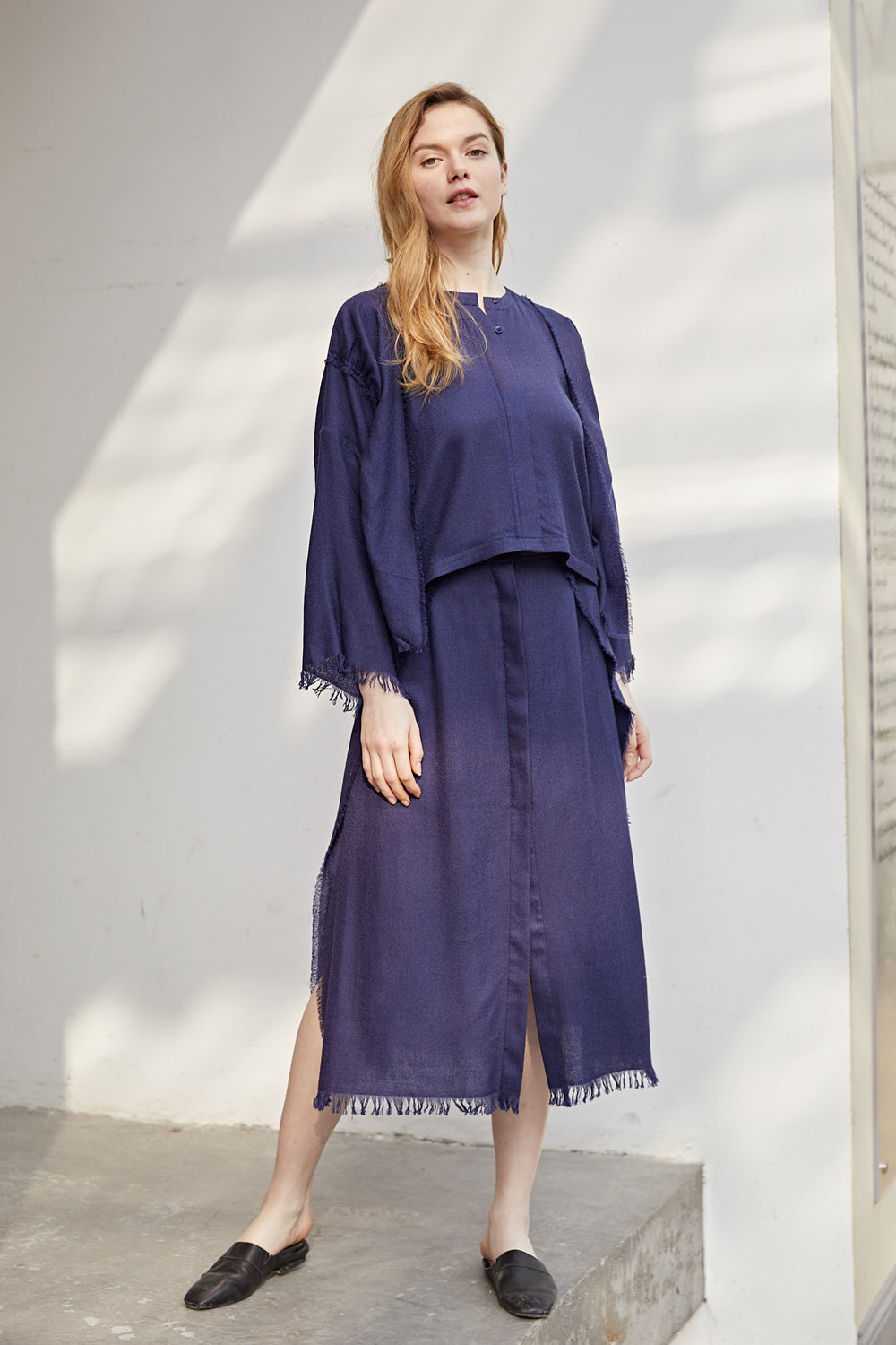 Pants: Super fine cashmere maxi skirt with hand-made fringed edge.