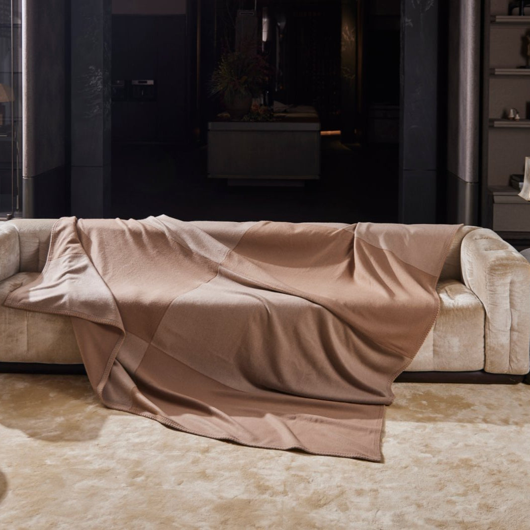Pure cashmere blanket with two-tone color joint together. Serging techniques makes the seams tighter and last longer. Adhere to using natural, environmentally friendly cashmere that is free of additives. This ensures that the cashmere fibers retain their original color and glow.