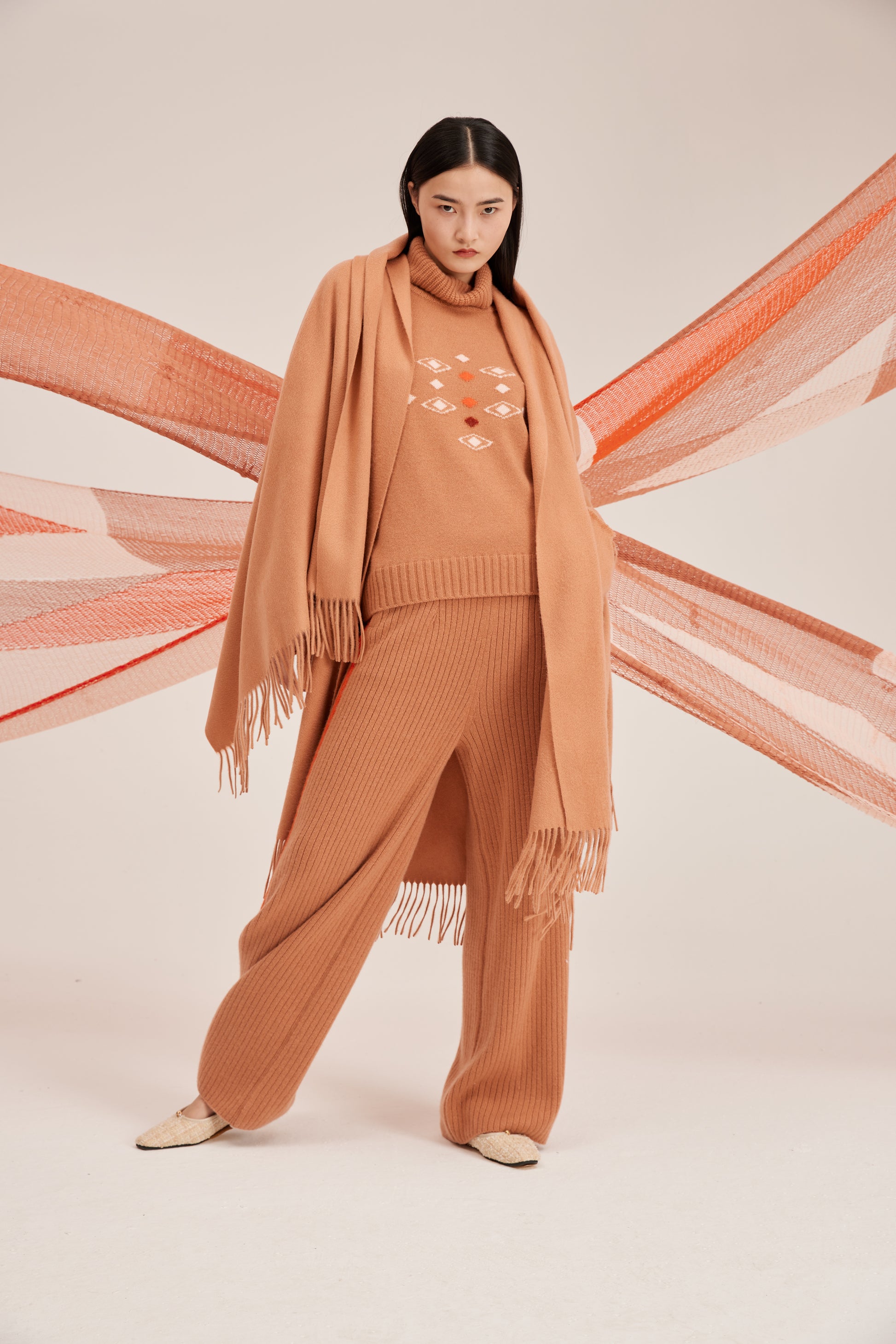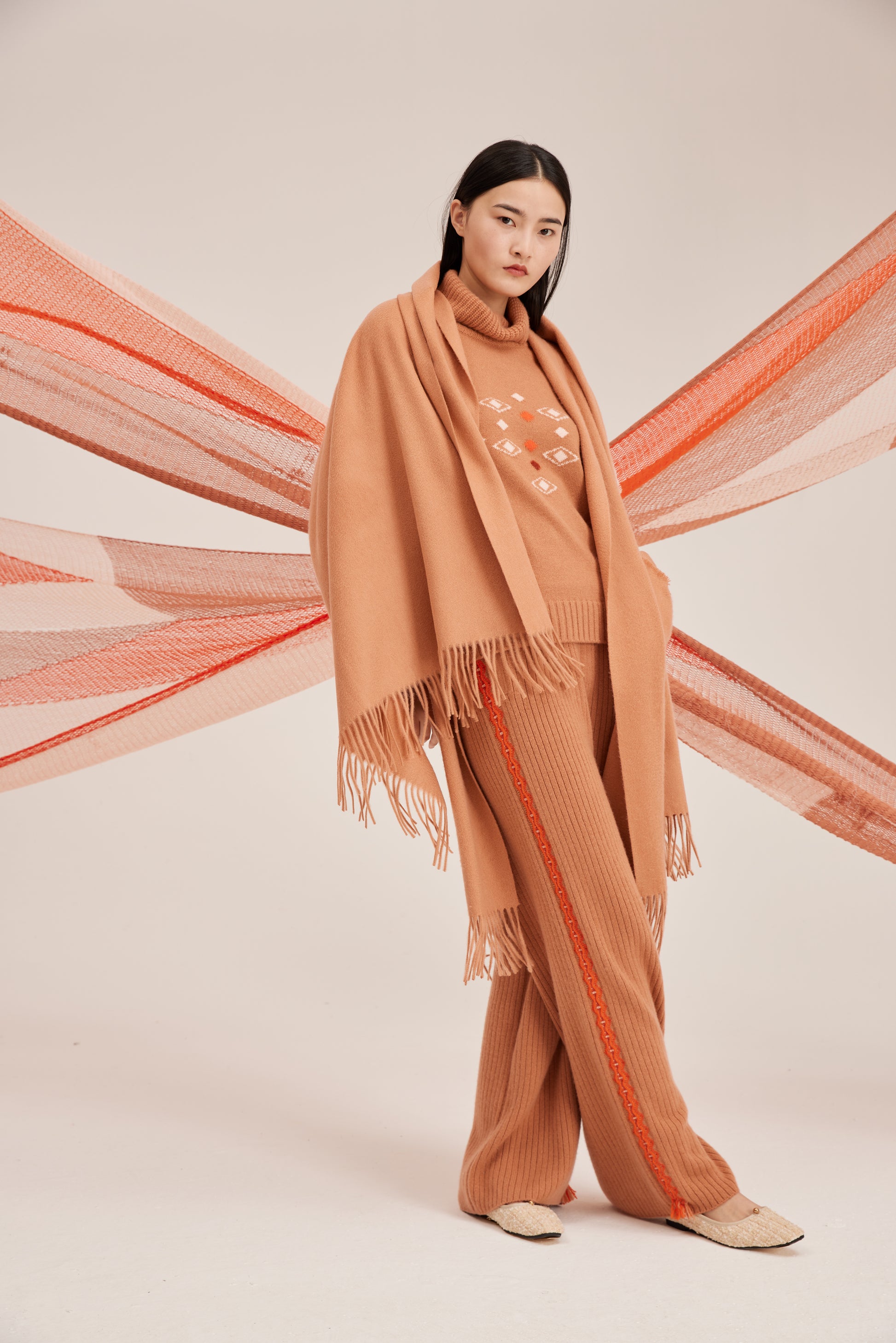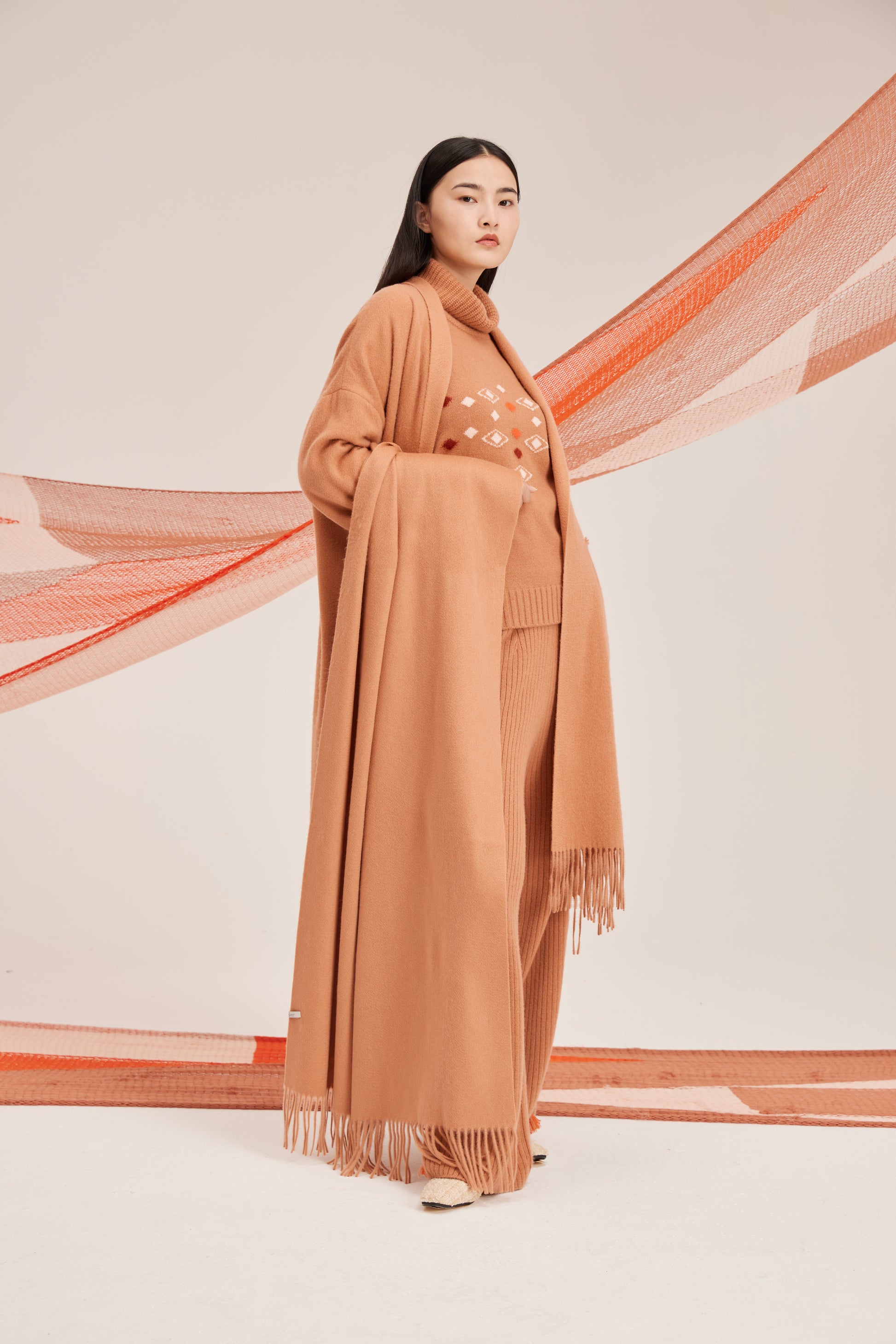 Fashioned in sumptuously-soft cashmere, this super large shawl is detailed with elegant water wave pattern, finished with a classic tassel trim.
