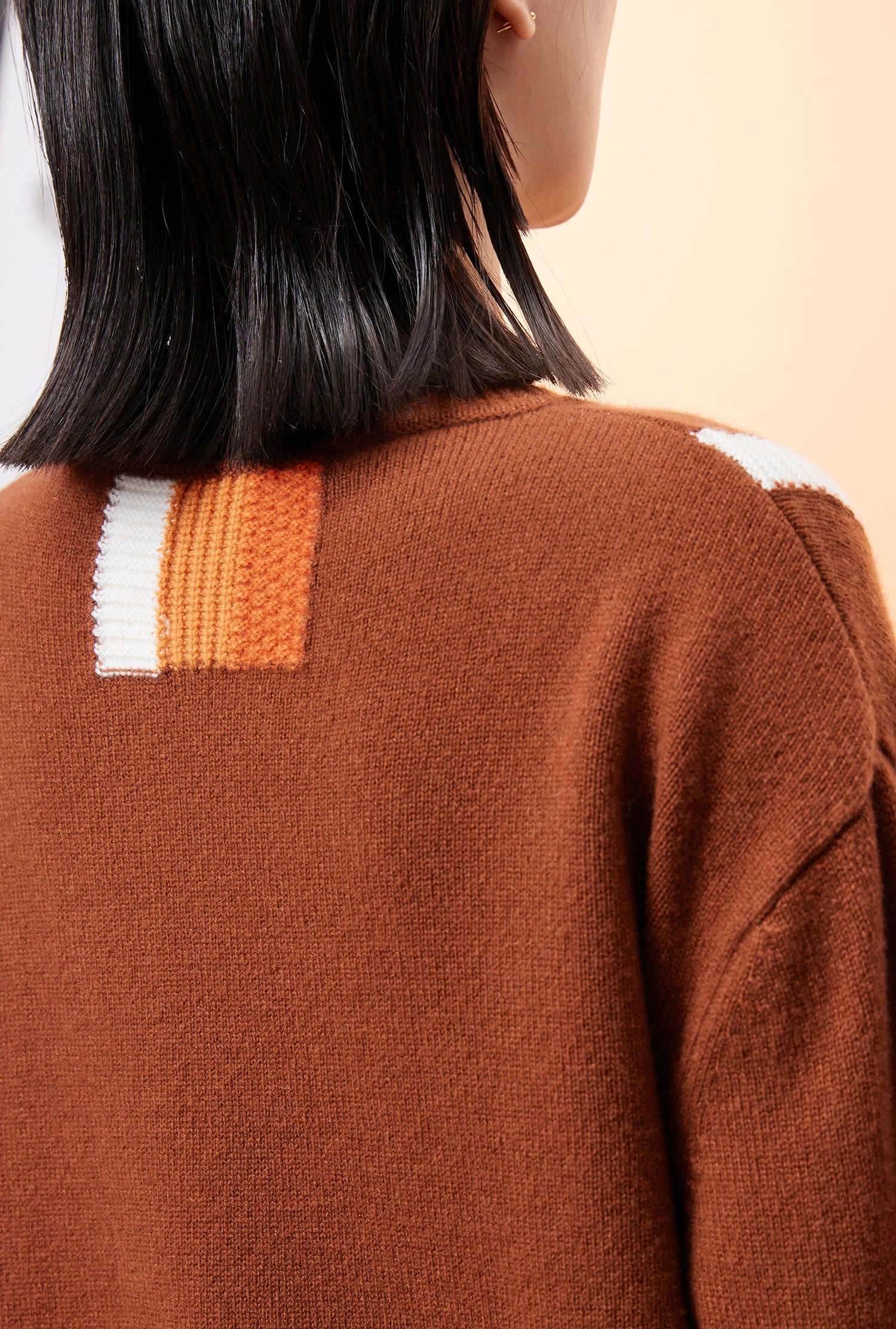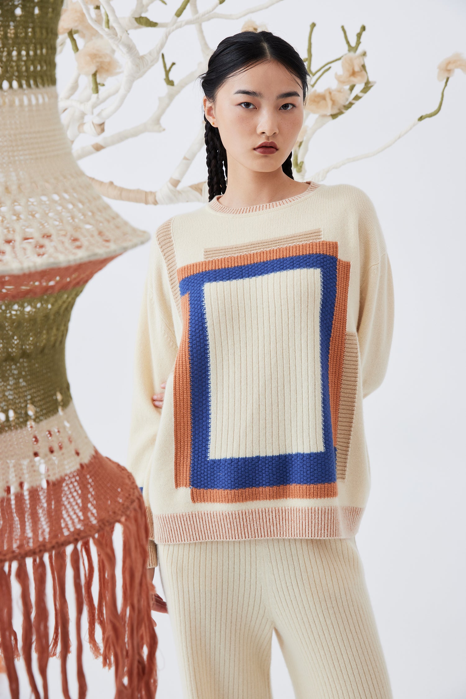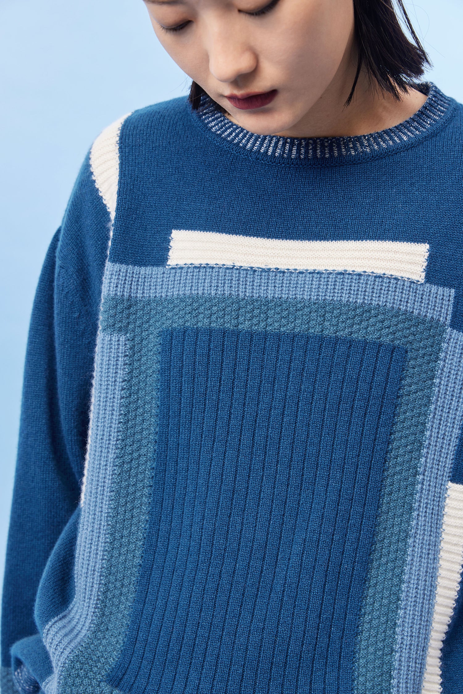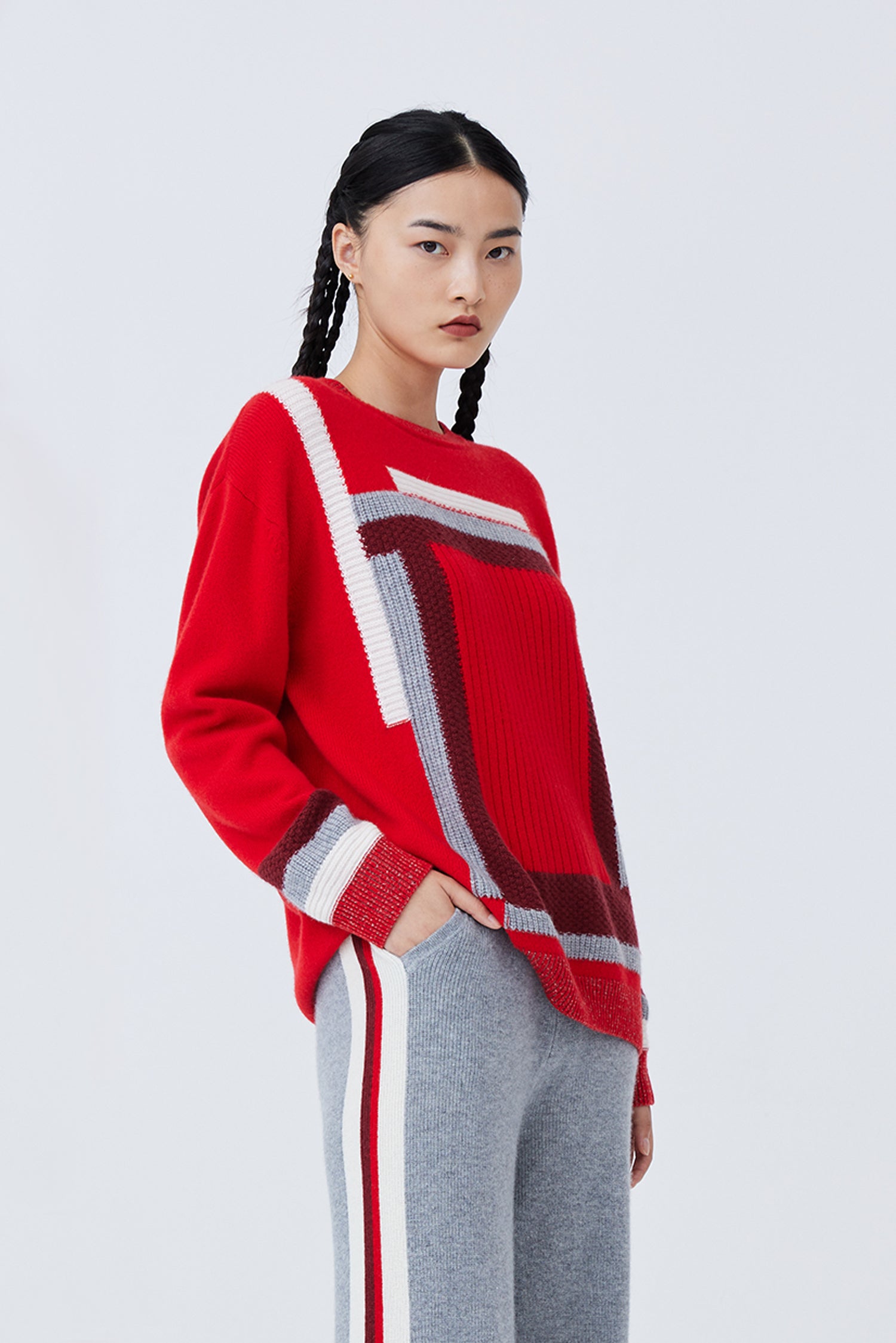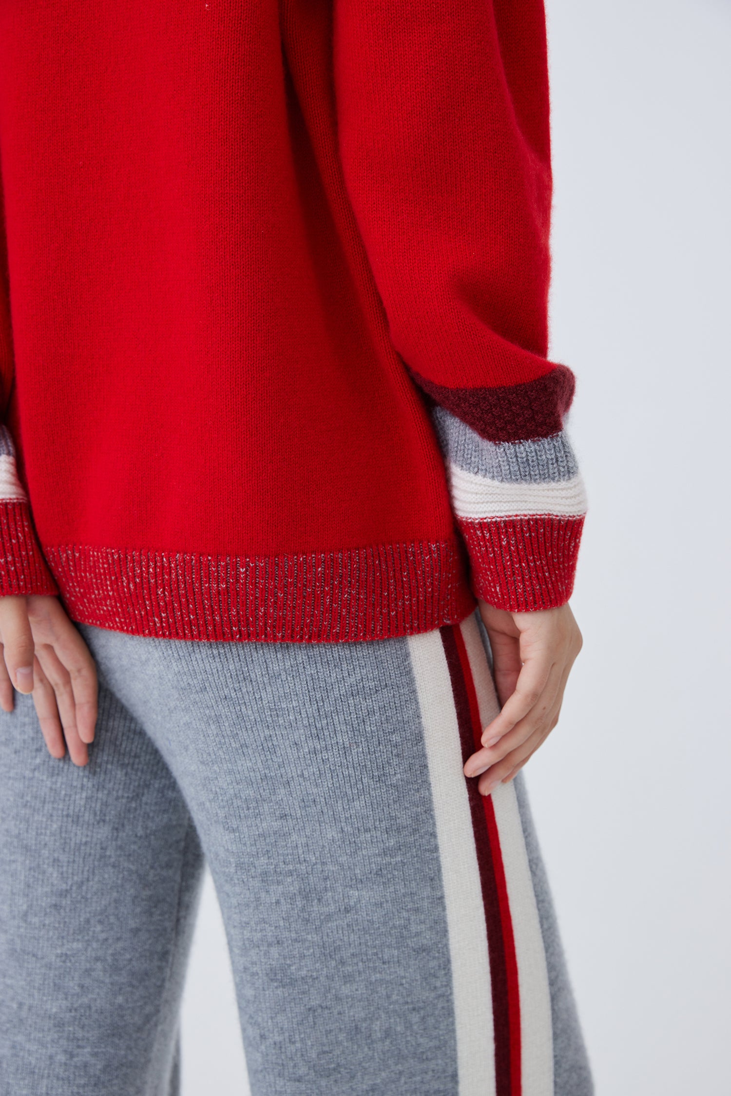 Crew neck pure heavy cashmere top featuring ribbed-knit details and color blocks.