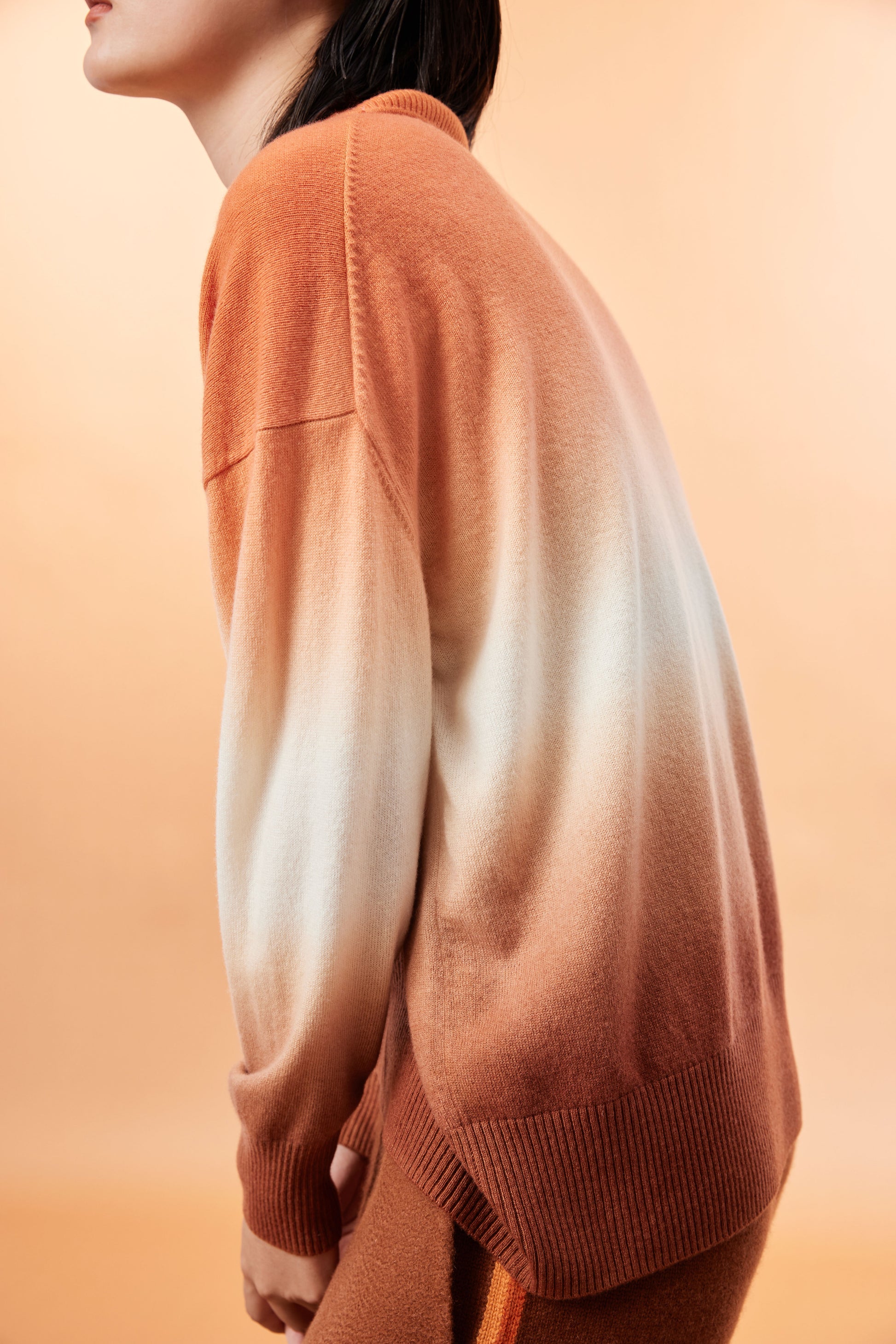 Gradient crew neck ribbed-knit cashmere top featuring long sleeves, with handmade dip-dye color.