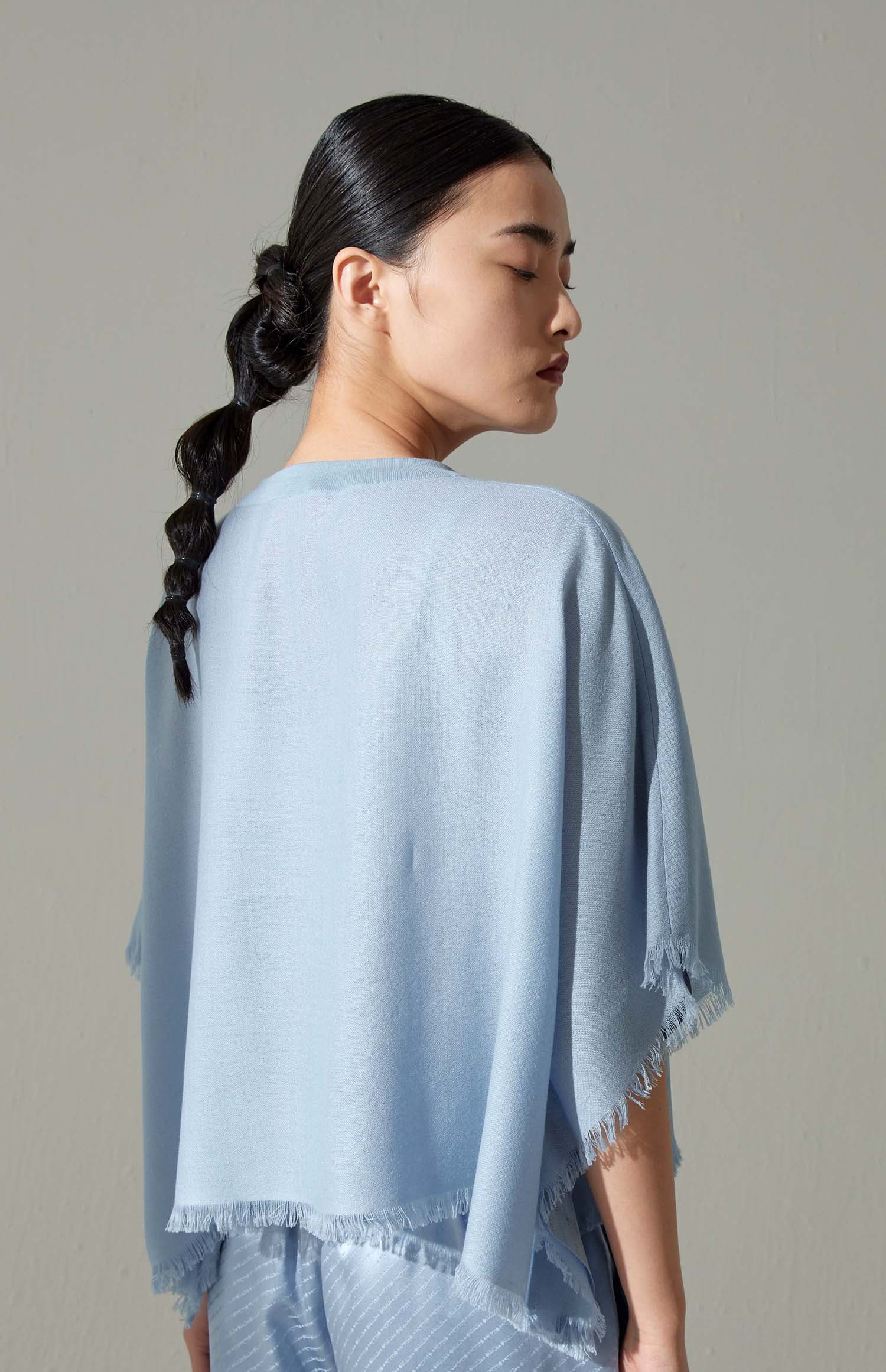 Super fine cashmere loose-fit top, pure silk front panel, which jacquard by Mongolian character "zero" that stands for the idea of "Zero Waste" of Sandriver, joined with pure cashmere front flyer and back panel. A crew neckline, hand-made fringed edge.