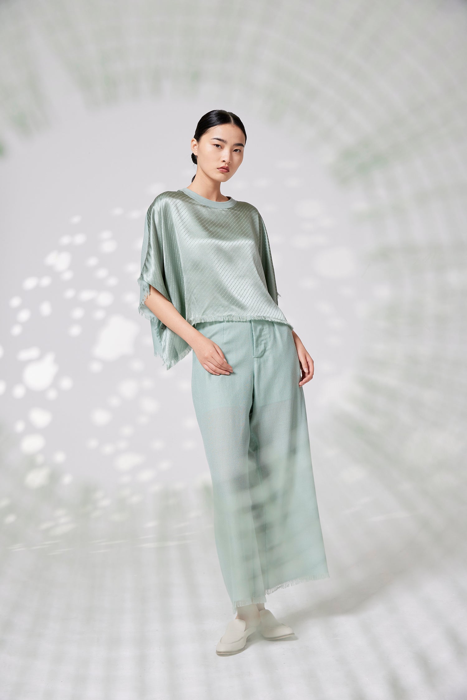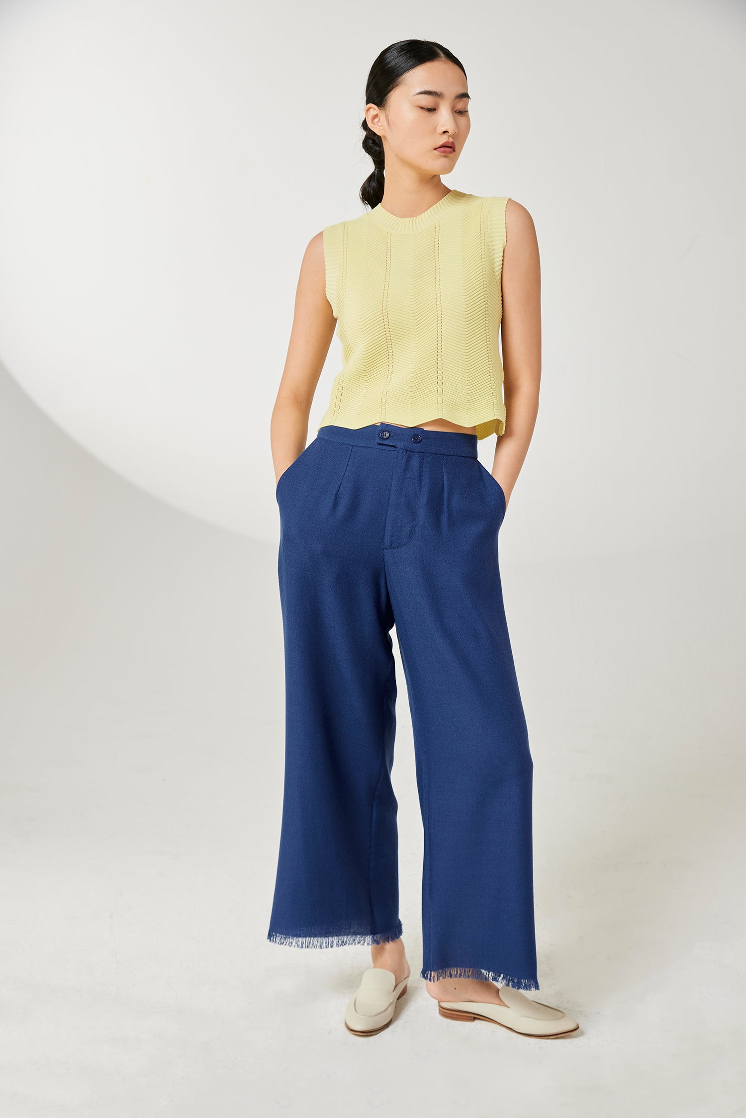Super fine cashmere wide-leg trousers, fringed edge detailing. High waist, two side slit pocktes.